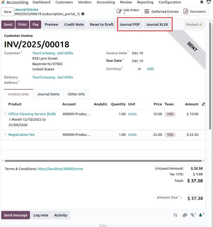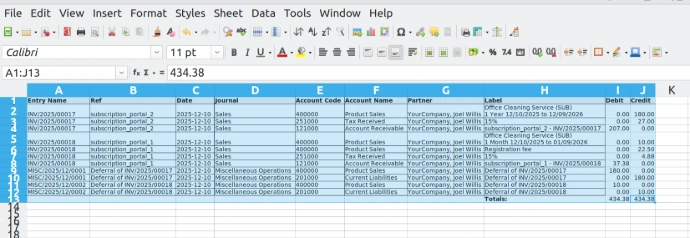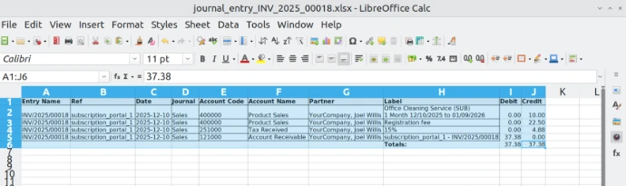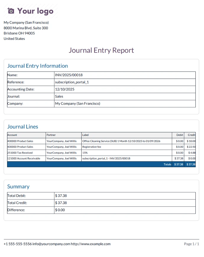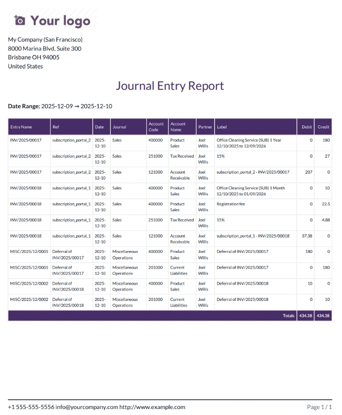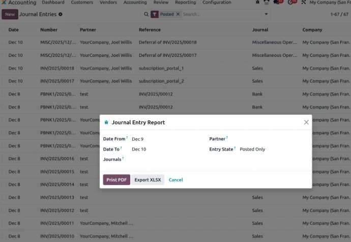 - Open Accounting → Reporting → Journal Entry Report to generate PDF/XLSX.