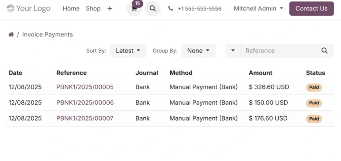 - Clean list view including date, reference, journal, method, amount, currency & status