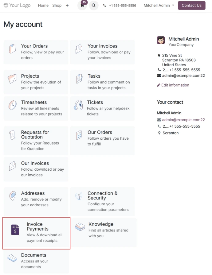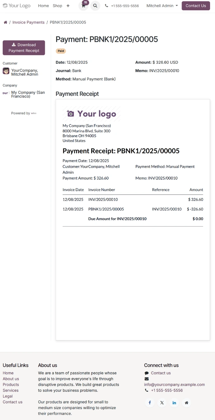 Empower your customers with complete payment transparency. This module adds a professional, search-enabled, groupable portal interface where users can view, filter, and download their official payment receipt PDF documents generated by Odoo.