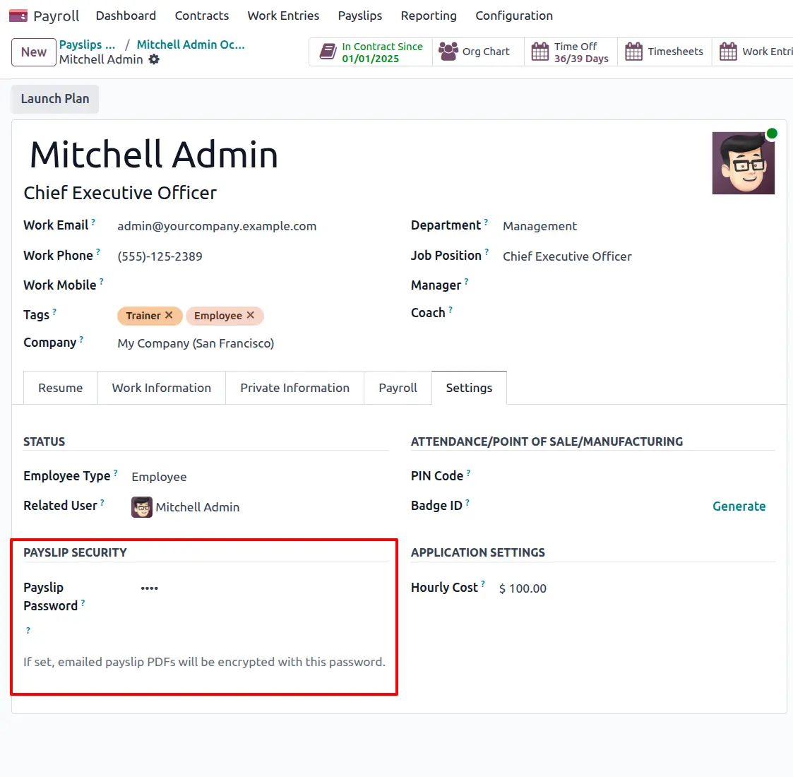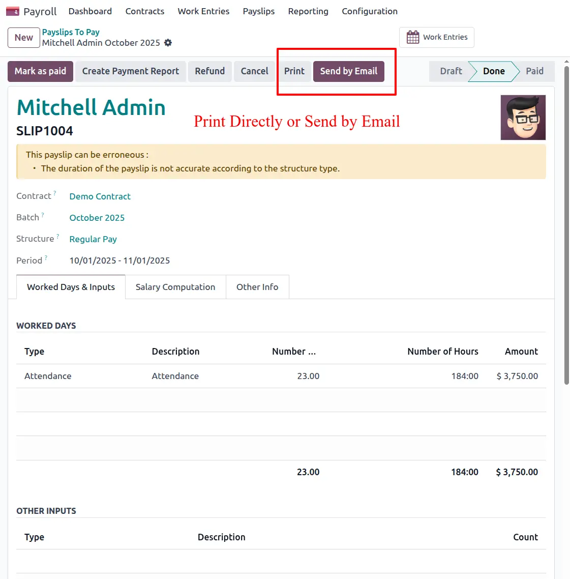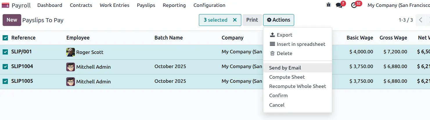 - Open Payroll → Payslips → (To Pay | All Payslips) → Click “Send by Email” or “Print”