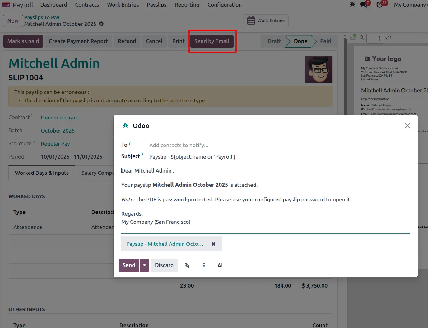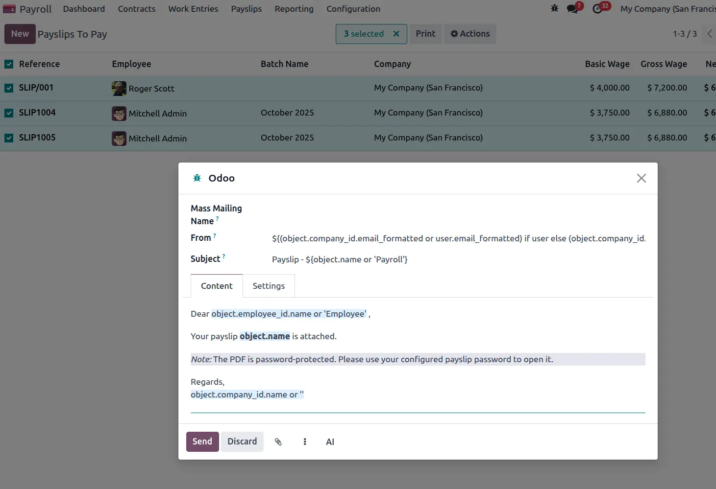 Send By Email Wizard with auto populated email body and attached encrypted payslip