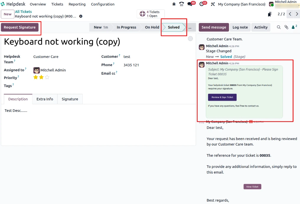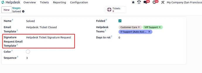- Open **Helpdesk → Stages**, assign a Signature Request Email Template