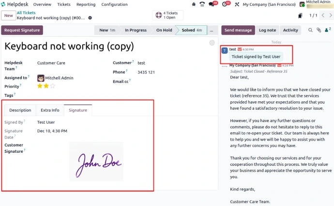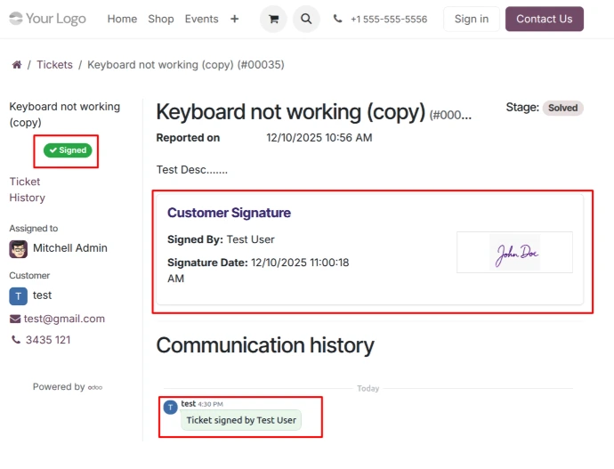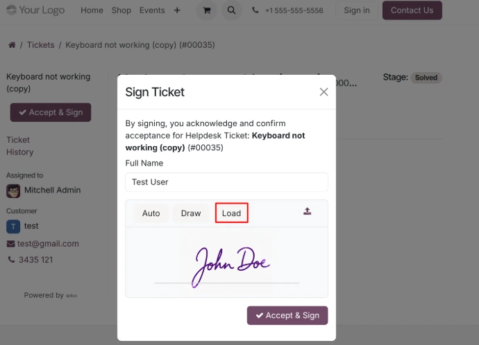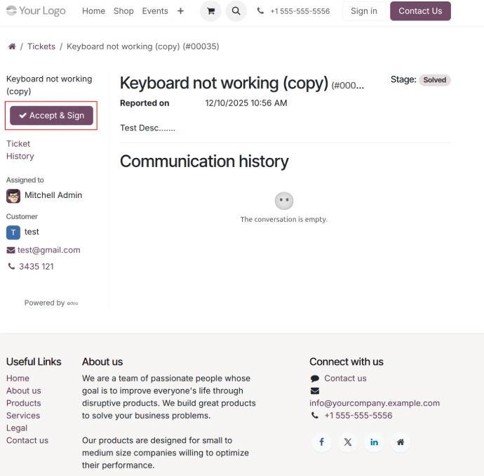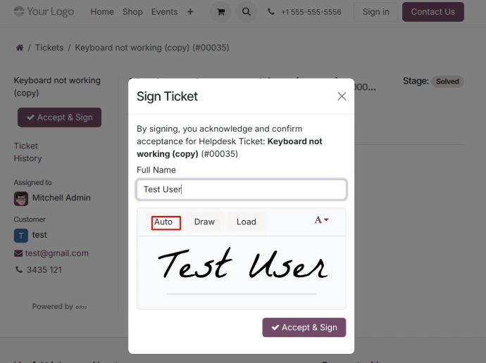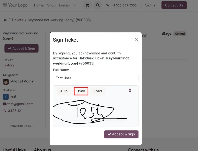 Enable seamless digital approvals for helpdesk tickets. Customers can review and sign tickets directly from the Odoo portal — just like quotations and invoices.