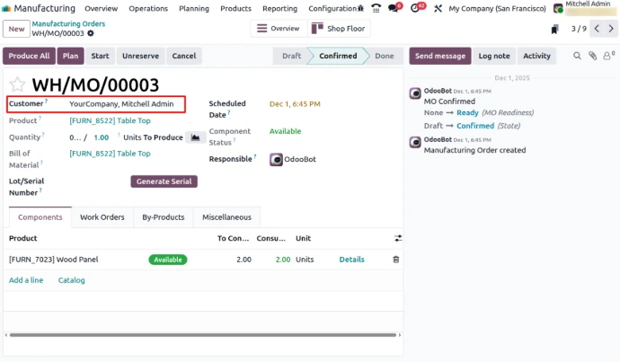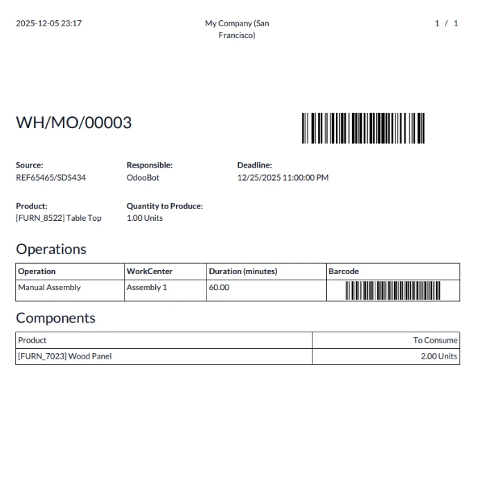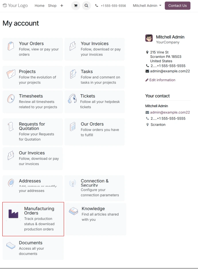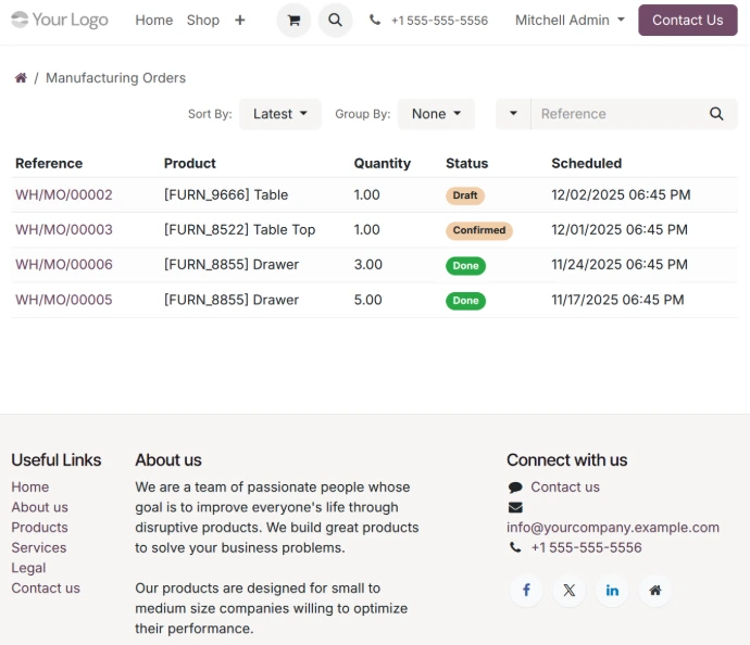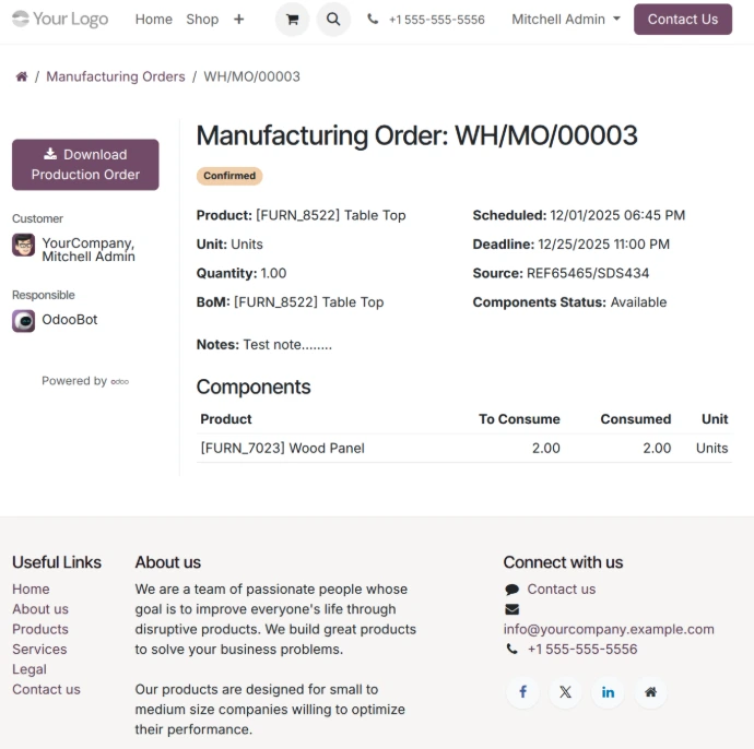 Provide your customers complete visibility into their Manufacturing Orders through the Odoo Portal — including production status, scheduled dates, components, deadlines, responsible user, and PDF generation.