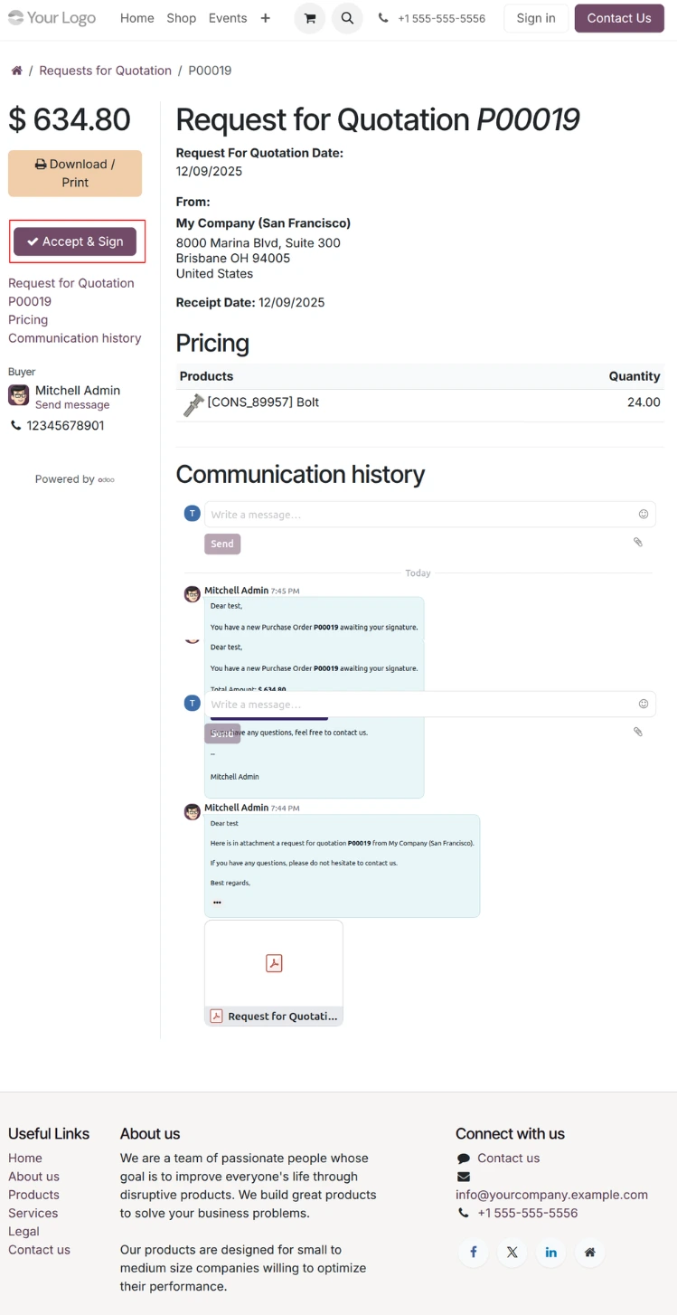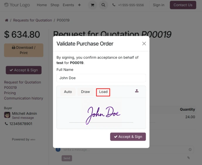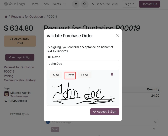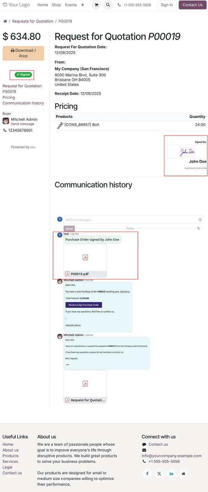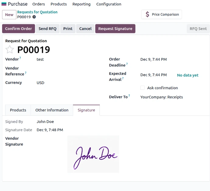 Allow vendors to review & sign Purchase Orders directly from the Odoo Portal. Signature, name & date are securely stored and added to the PO PDF output.