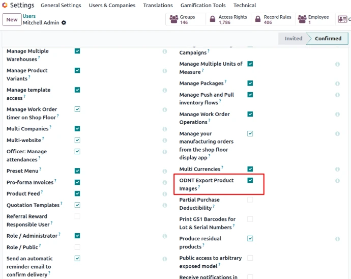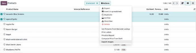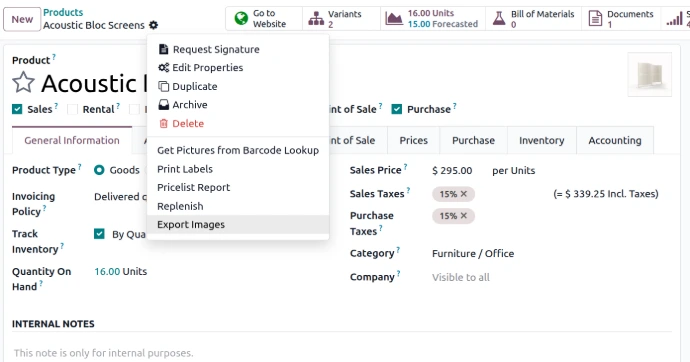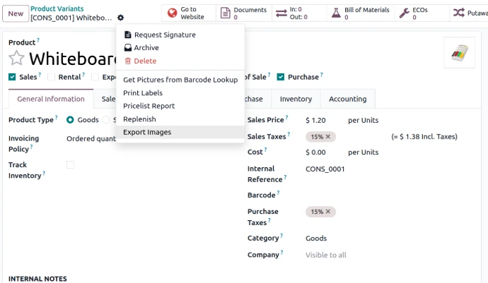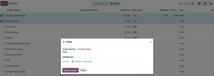 Export all product images in one click — including main product image, additional media images and ecommerce gallery images. Supports both product templates and product variants with access control and naming customization.