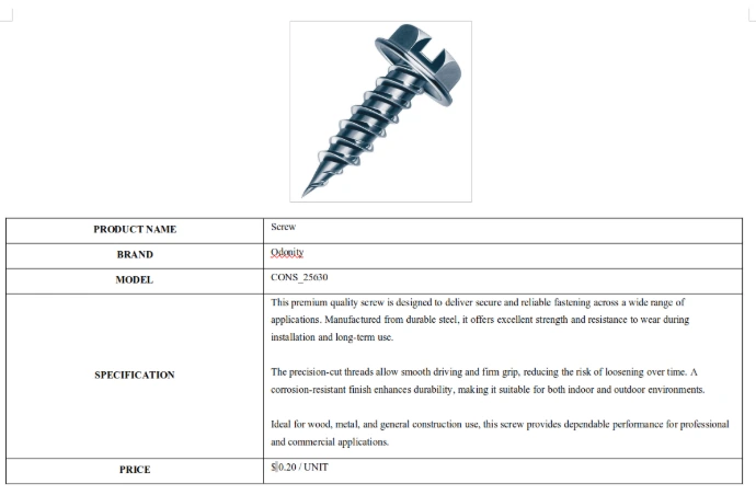 - Style 1: Single product catalog with image and detail table