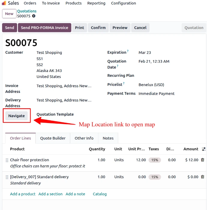 - Coordinates stored in sale order & partner