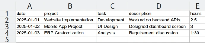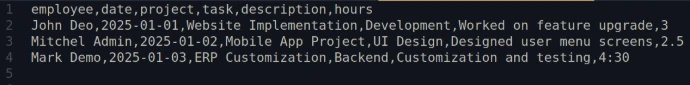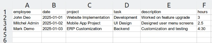 Import employee timesheets in bulk using CSV or XLS files. Supports single employee import as well as multi-employee import for authorized managers. Includes project validation, task verification and smart HH:MM time support.